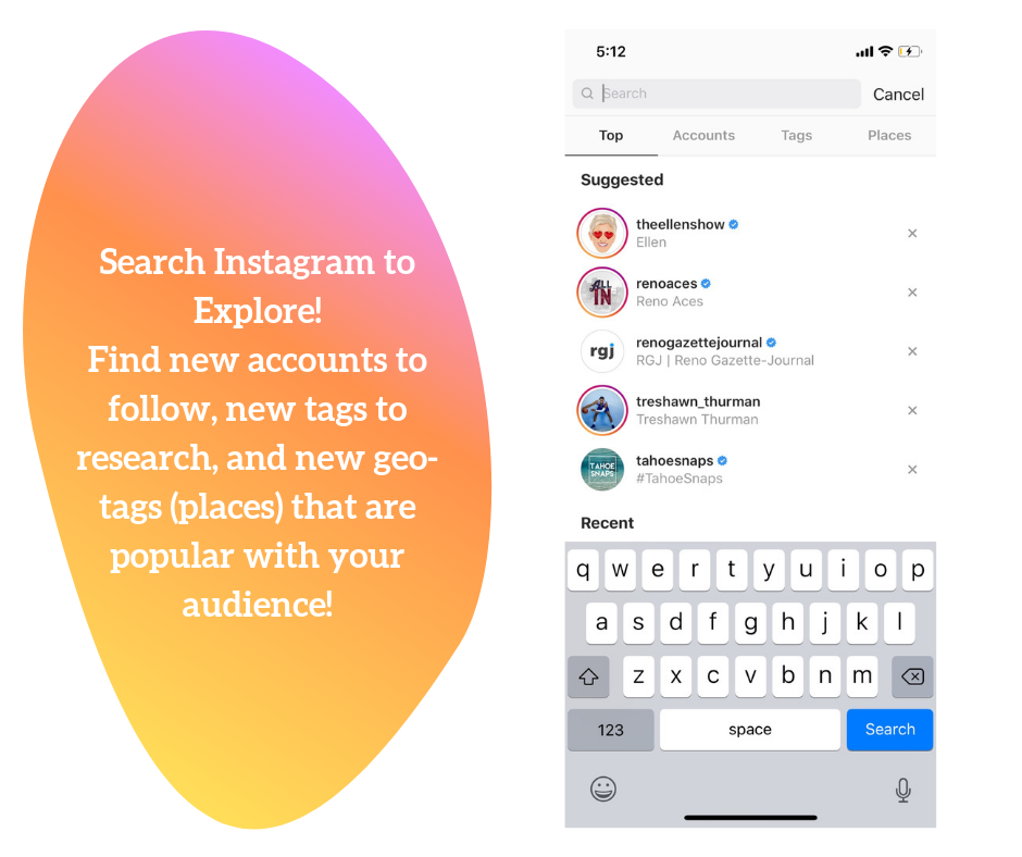 Search – this is where you can “explore” posts. A unique mixture of photos and videos comes up for everyone based on photos and accounts you follow and interact with. You can also search for people, accounts, hashtags (tags), and places. Places is how you “geo-tag” a specific location.