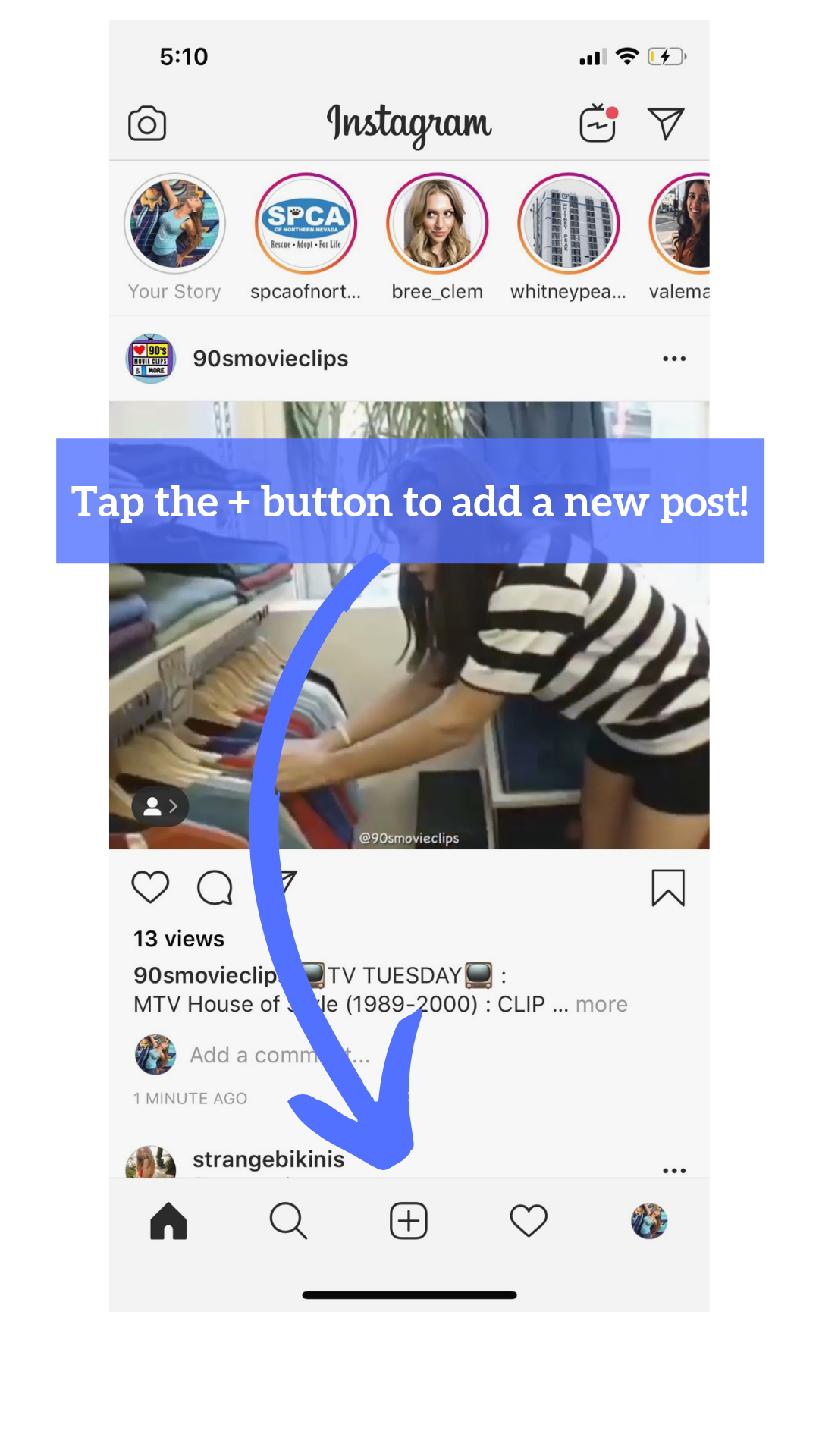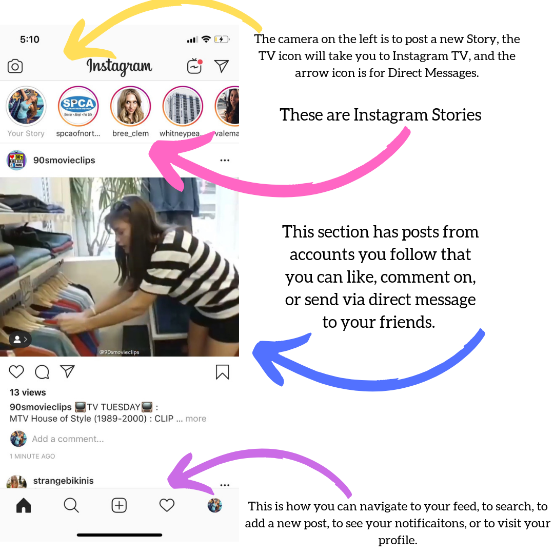 The Feed – this is where you see all the posts from people you follow. You’ll also notice sponsored posts mixed in. These always will say sponsored and will have a link to a website page. The feed is a crucial piece of your marketing plan – it’s a way for you to directly send love to individual followers. Use your “like” button (by either double tapping or by taping the heart icon on the post) but do be aware that everyone on Instagram can see which photos you have liked. Stay away from liking inappropriate/offensive photos or memes or anything that is off brand.