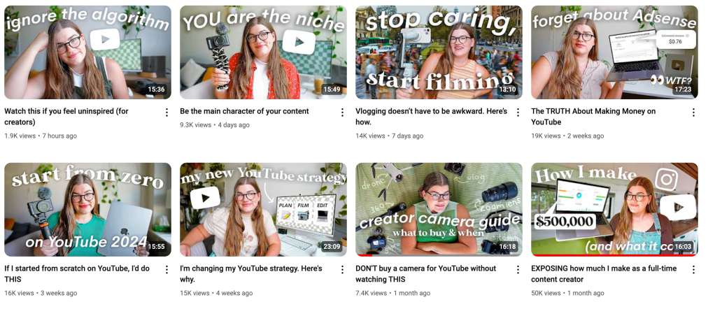 Katie makes content about how to build a YouTube channel and successful personal brand. She has 286k subscribers on this channel (she has a few different YouTube channels and brands that she now owns) and has been making videos for over a decade. This channel has 820 videos. Check out how often she is posting: